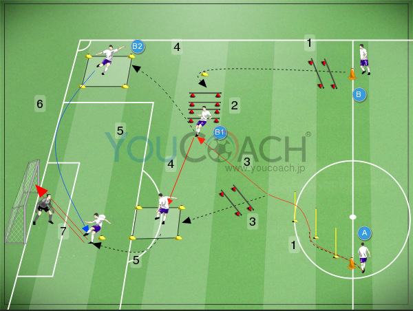 スピード、狭いスペースでのパスワーク、クロス、そしてフィニッシュを鍛えるサーキットトレーニングです。FCバルセロナのトレーニングより抜粋 |