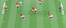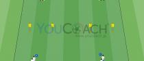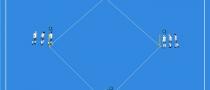 - Aは右サイドのスクエア内に向けてパスを送り込み、パスしたらすぐにミニスクエアを出てマーカーを通過したらクロスに合わせる準備(A2)。