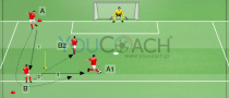 - A1は背後からオーバーラップしてきたB1に横パス(5)、そしてパスしたA1はGKが弾いたセカンドボールに備えてA2に進みます。