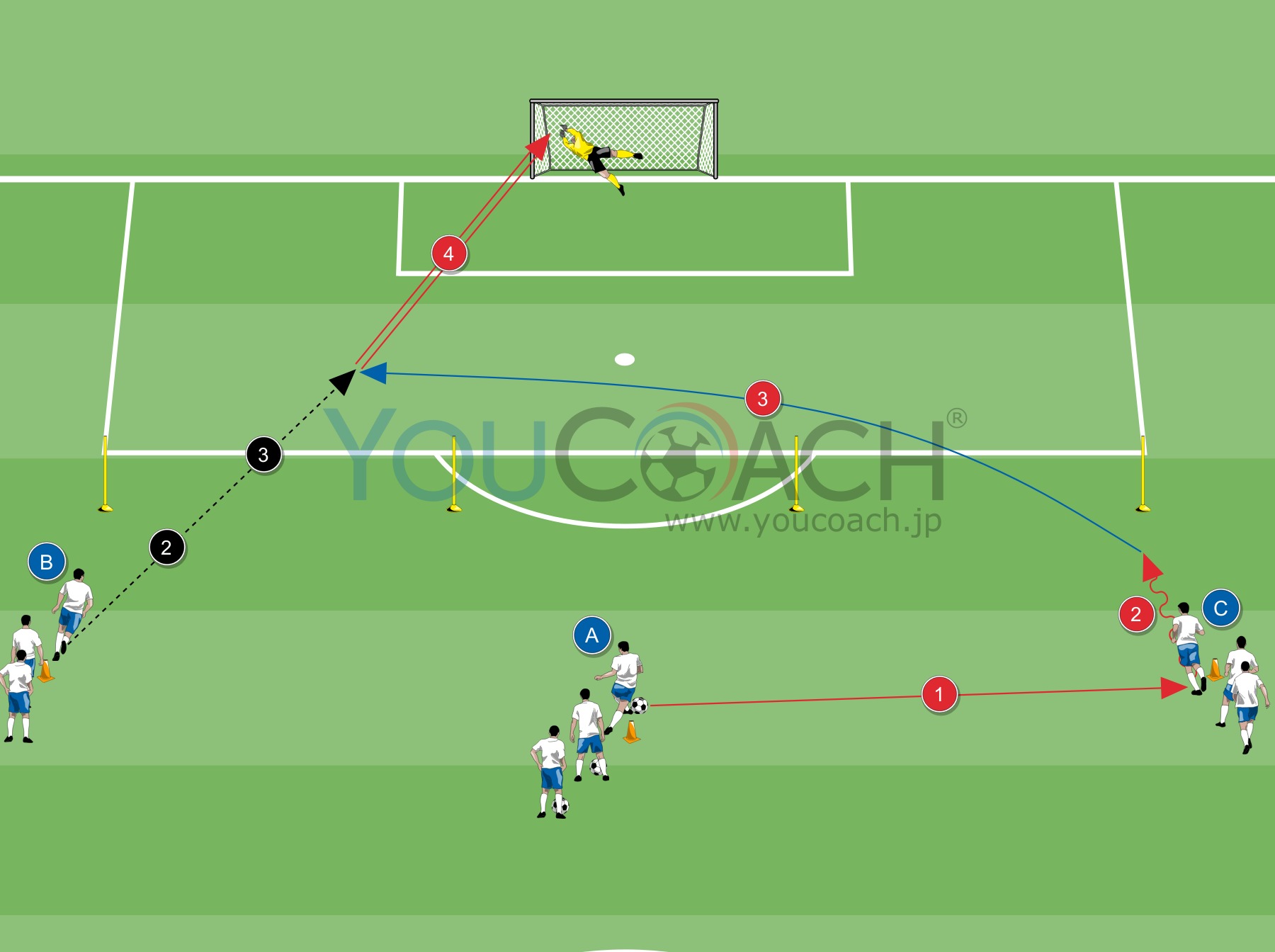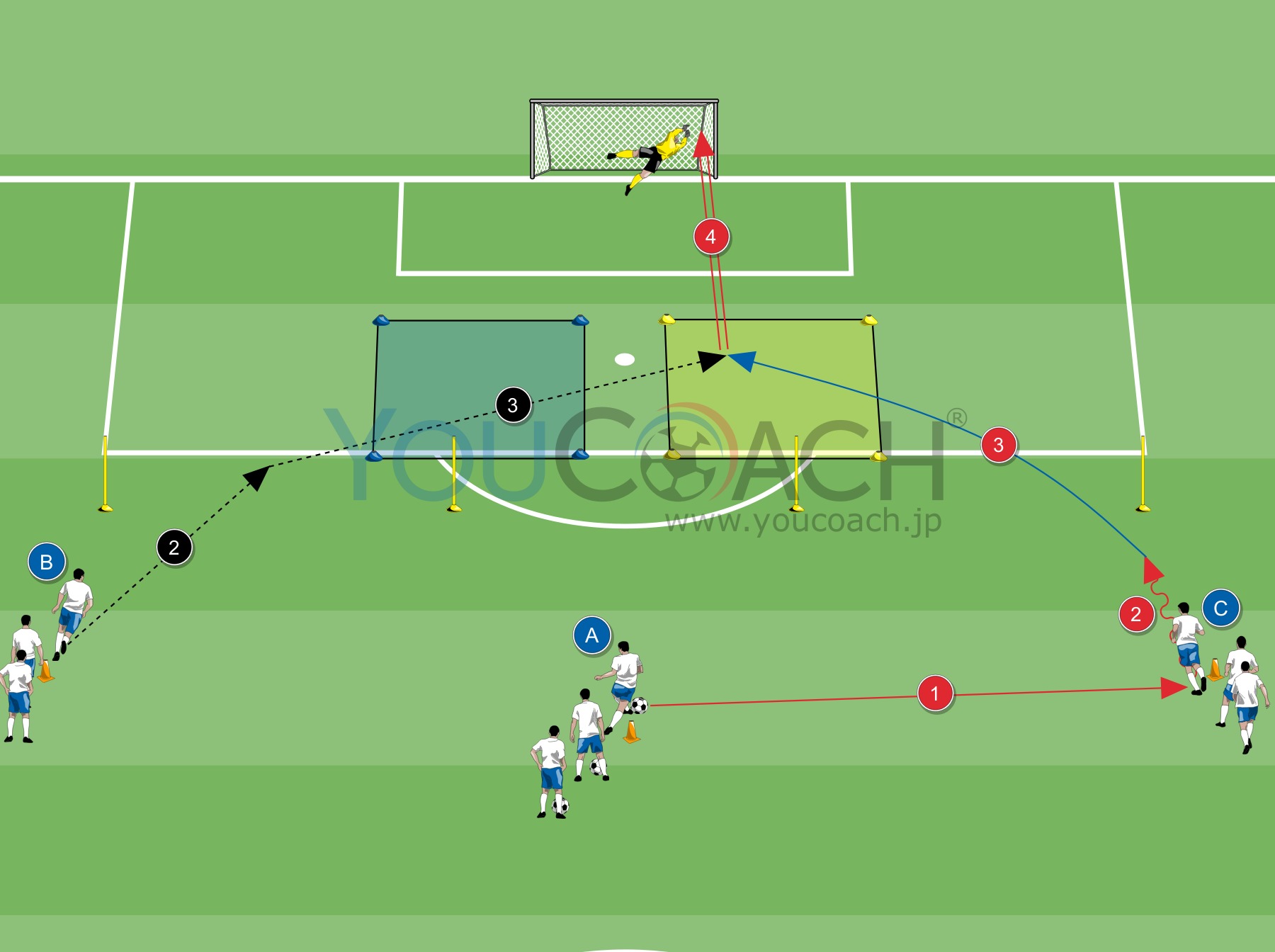 - 7x7mのミニスクエアを2ヶ所(青と黄に色分け)ペナルティエリア内に作ります。配置の目安はポール真ん中2本の間ぐらい。プレーヤーAはパスした後、青か黄の色を指定します。指定された色のスクエアにクロスボールを送ります。(図例では黄色)