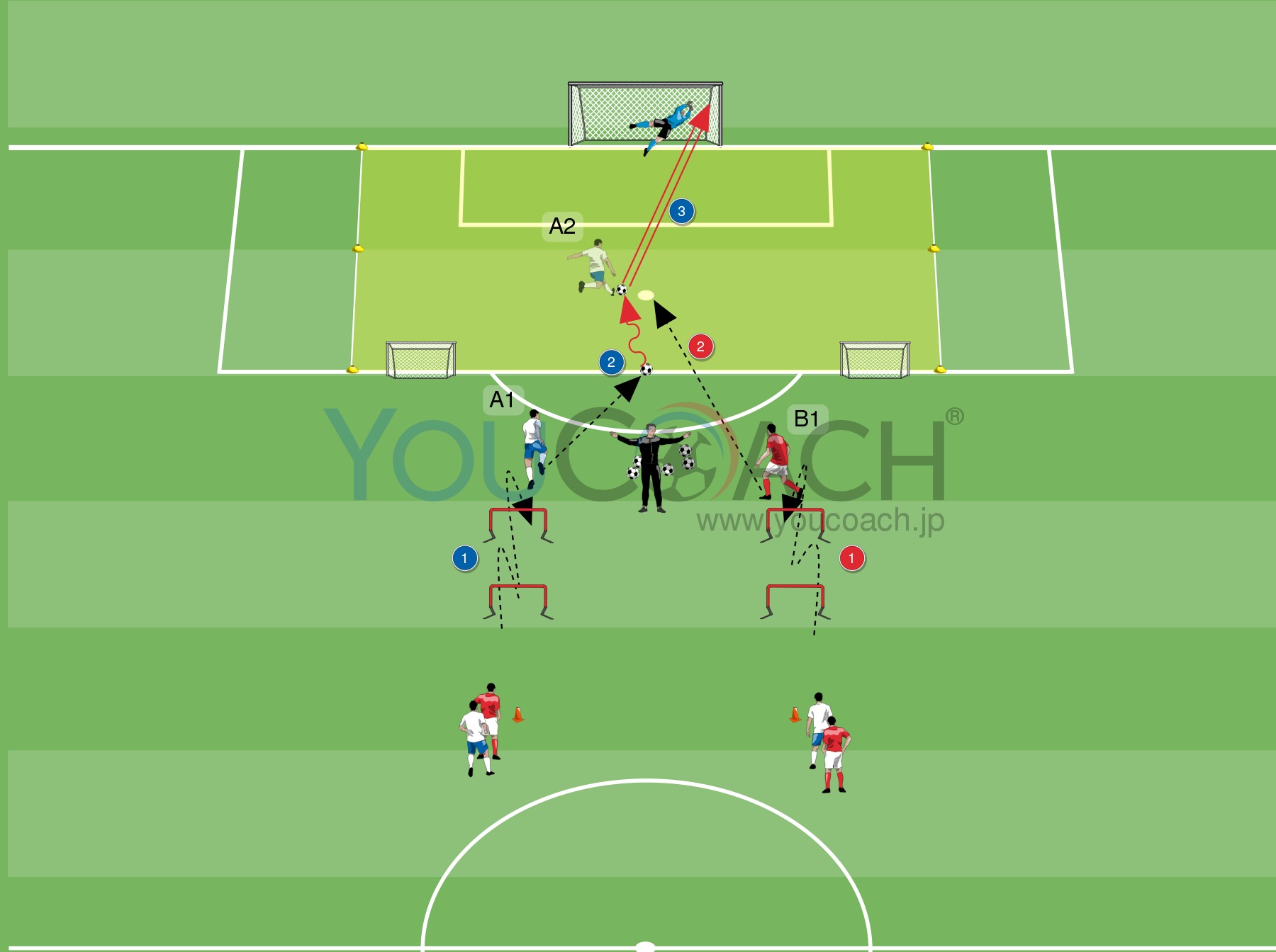 もしGKがセービングした場合、ディフェンスとGKが仲間となり、2対1の状況に変わります。攻撃方向はミニゴール2ヶ所のうちどちらか1つ。ボールが外に出るかゴール(大ゴールかミニゴール)が決まるまでプレーは継続します。プレーを終えたら、コーチはペナルティエリアライン上にボールを1つ置き、次のペアの勝負の準備。2組目も同じくハードルを通過後、緑ゾーンに残った味方と共に2対2開始。