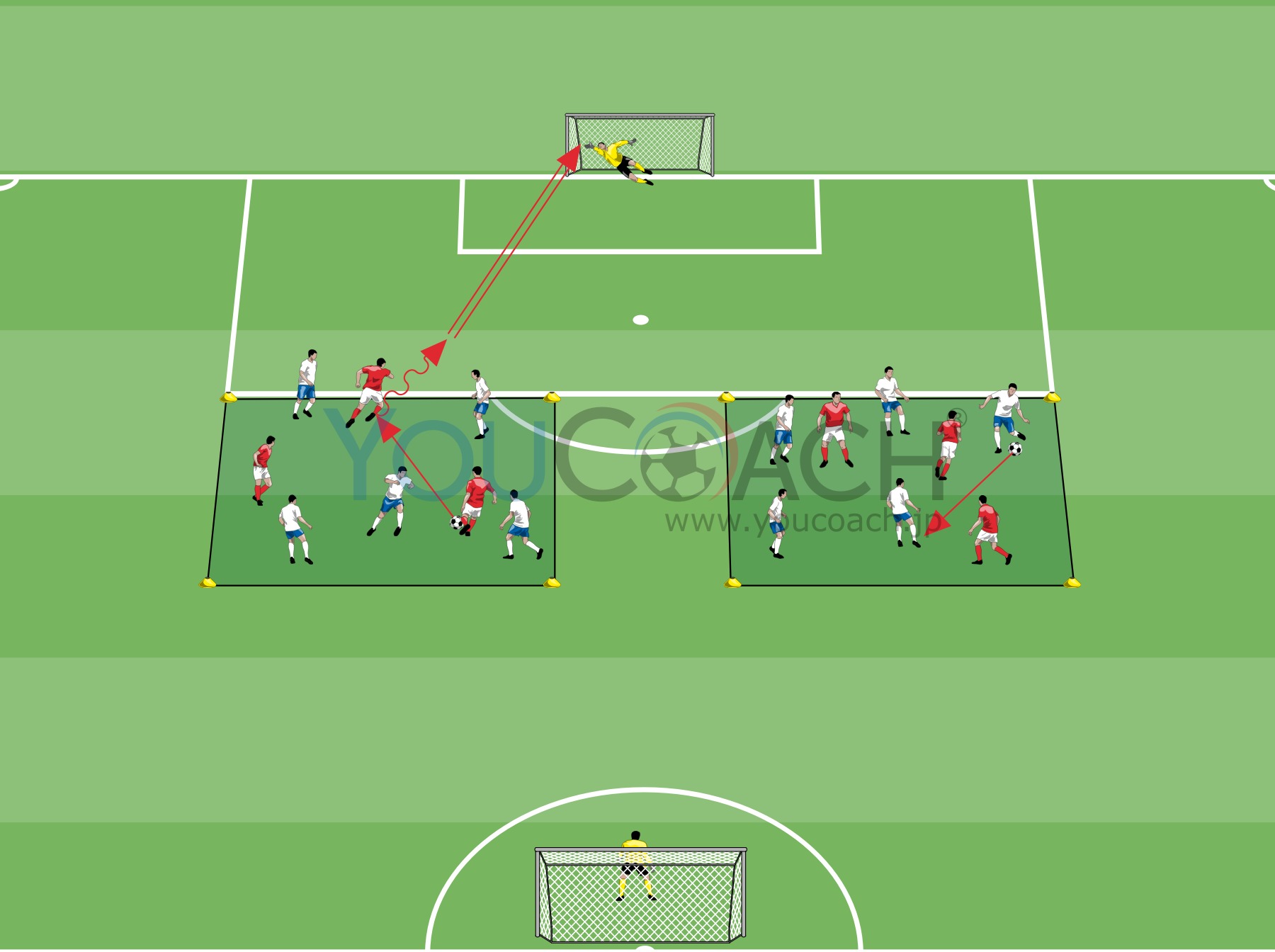 40x60mプレーエリア内の40m辺側にゴールを1ヶ所ずつ配置。エリア中央には25x25mのスクエアを図のように配置。左のスクエアには赤5名、白3名を、右のスクエアには白5名、赤3名をスタンバイ。両ゴールにGKを入れたら準備完了。数的優位のチームからプレースタート。