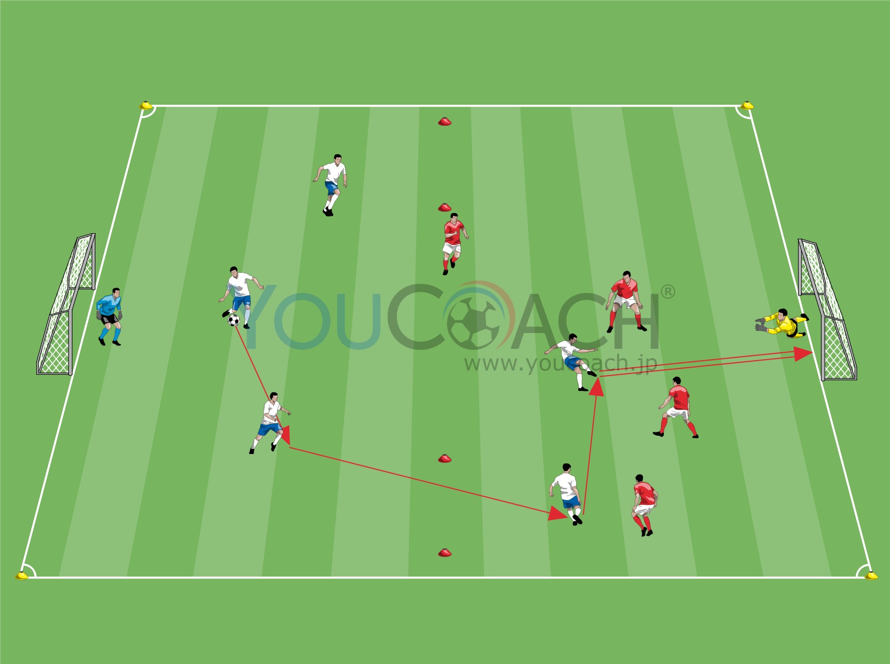 30x40mプレーエリアのハーフラインの左右に2mサイズのミニゴールを図のように配置します。ゴールを1ヶ所ずつセットしたら2チームに分けてトレーニングの準備完了。