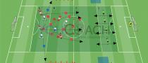 これは、ディフェンス陣に理想的なポジショニングを取らせる時間を与えないことで、トップスピードで攻撃を行う事の概念を理解させるためのメニューである。ディフェンダーは、より早くポジショニングを取りオフェンス陣の攻撃を阻む。パススピード、オフェンスのプレイヤーのマークを外す動き、そして展開局面のインテンシティの高さは、ディフェンダーの混乱を引き出し、利用することを目的としている(ディフェンス陣に統率の取れたポジショニングを行わせない)。ディフェンダーは他にも、相手チームの攻撃の展開を遅延させるための継続的なプレスを行いつつオフェンス側のそういった策略から身を守らなければいけない。オフェンス(白)とディフェンス(赤)は、図中に見えるようにグラウンド上に距離を取った状態で横一列に立つ。ただし、D1のプレイヤーのみはペナルティーエリアから1番近いに立つ。その他のD2とD3のディフェンダーは、フィールド深くのゴールライン上に立つ。キーパーはゴールマウスに入りゴールを守る