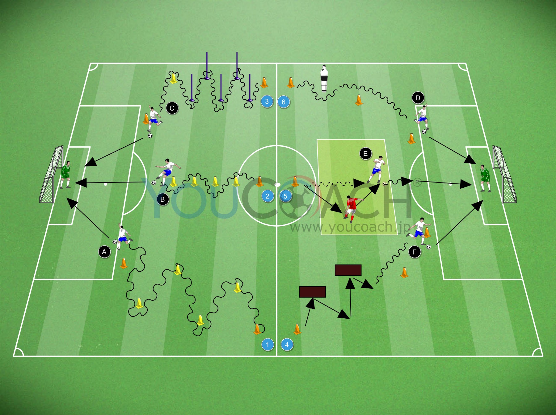 全コートを使用したトレーニングです。マテリアルは図に近い形で配置します。ハーフウェーライン付近にコーンを6個置いて、全1〜6コース(プレイヤーA,B,C,D,E,F)のスタート地点とします。各プレイヤー1名につきボール1球持っておきましょう。コーチは図の15×10mゾーンにスタンバイして壁パスを行います。