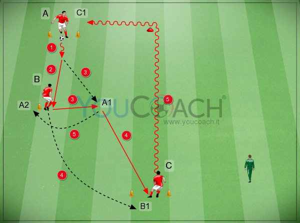 - Bはコントローロ・オリエンタート(方向付けされたトラップ)の後、Aの動きに合わせてワンツー(A1)。