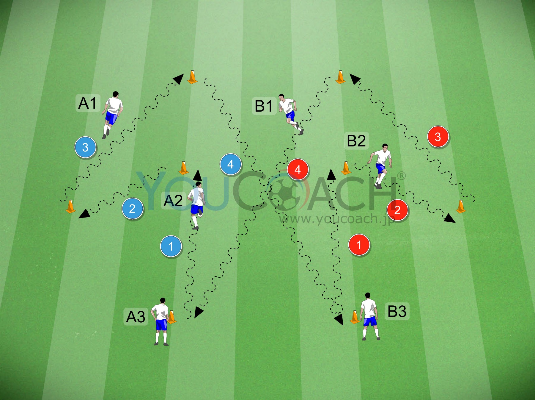 プレーエリアの中に幅が25メートルとなるように2つのコーン(1、4と数字で示します)を設置してラインを作ります。そのライン上にコーン1から10メートルの所にコーン2を置きます。コーン1とコーン2の中間、そこからみて右方向に5メートルの場所に、図のようにコーン3を設置します。同様に、左右対称となるように2つ目のサーキットを作ります。プレイヤーを2チームに分けて(AとB)、それぞれコーンの近くに並べます。