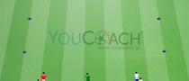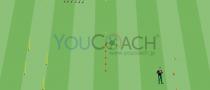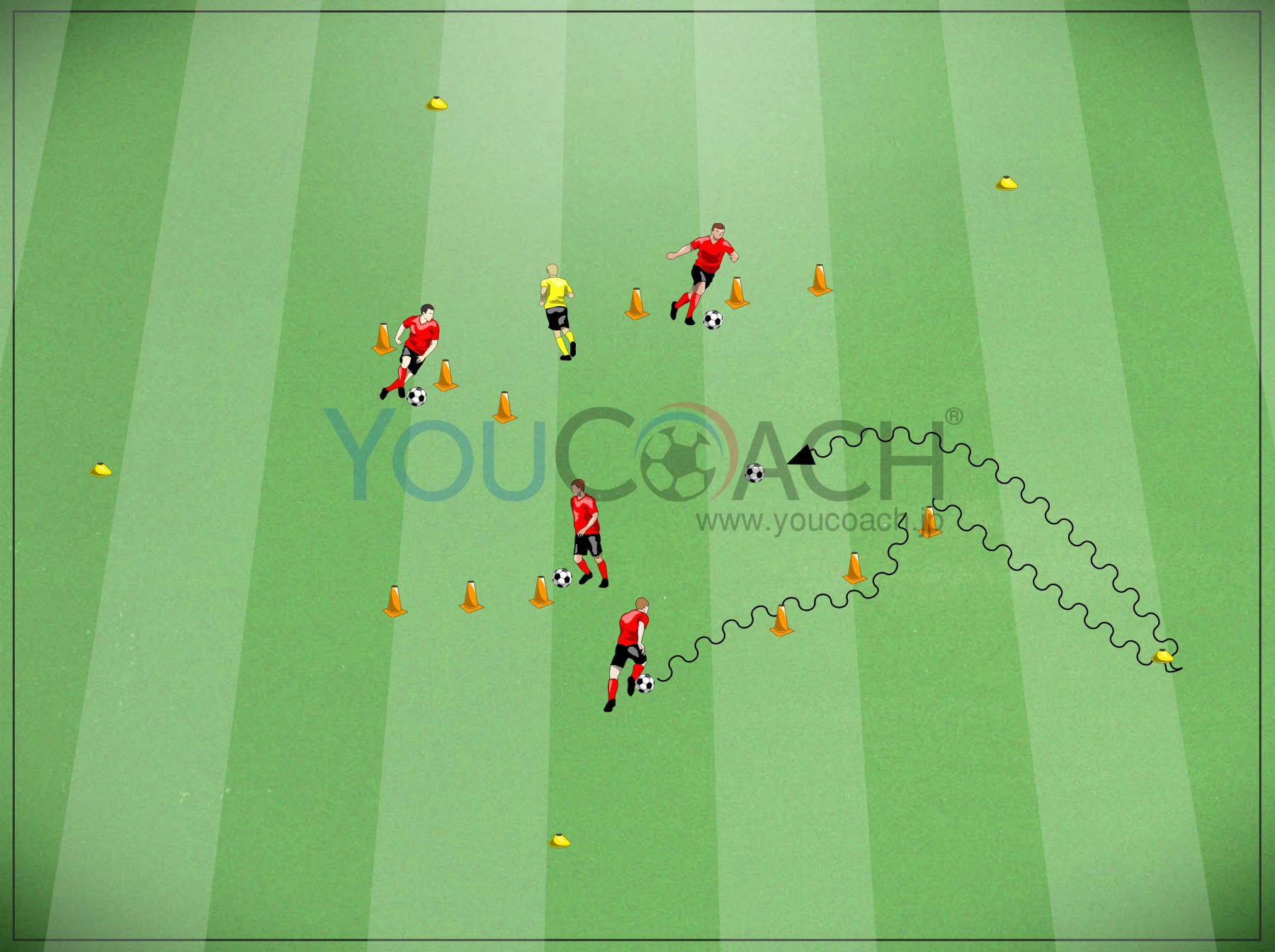 5人のプレイヤーはスペース内でボールドリブルする。この時、スラロームには入ってることはできない。黄色のビブスを着たプレイヤーがスタートの合図を出す。合図の方法は、ドリブルしていたボールを好きなタイミングで、好きな場所に置くこと。ボールを置いたら、外のマーカーに向かってダッシュしなければいけない。他の4人のプレイヤーは、スタートの合図でスラロームを自分で選択し、素早くドリブルで行う。スラロームが終わったら、外のマーカーを回って、最初に黄色のビブスの選手が置いたボールの所まで行く。一番早くたどり着けたプレイヤーの勝ち。このプレイヤーが、ビブスをもらい、次のスタートの合図を出す役になる。