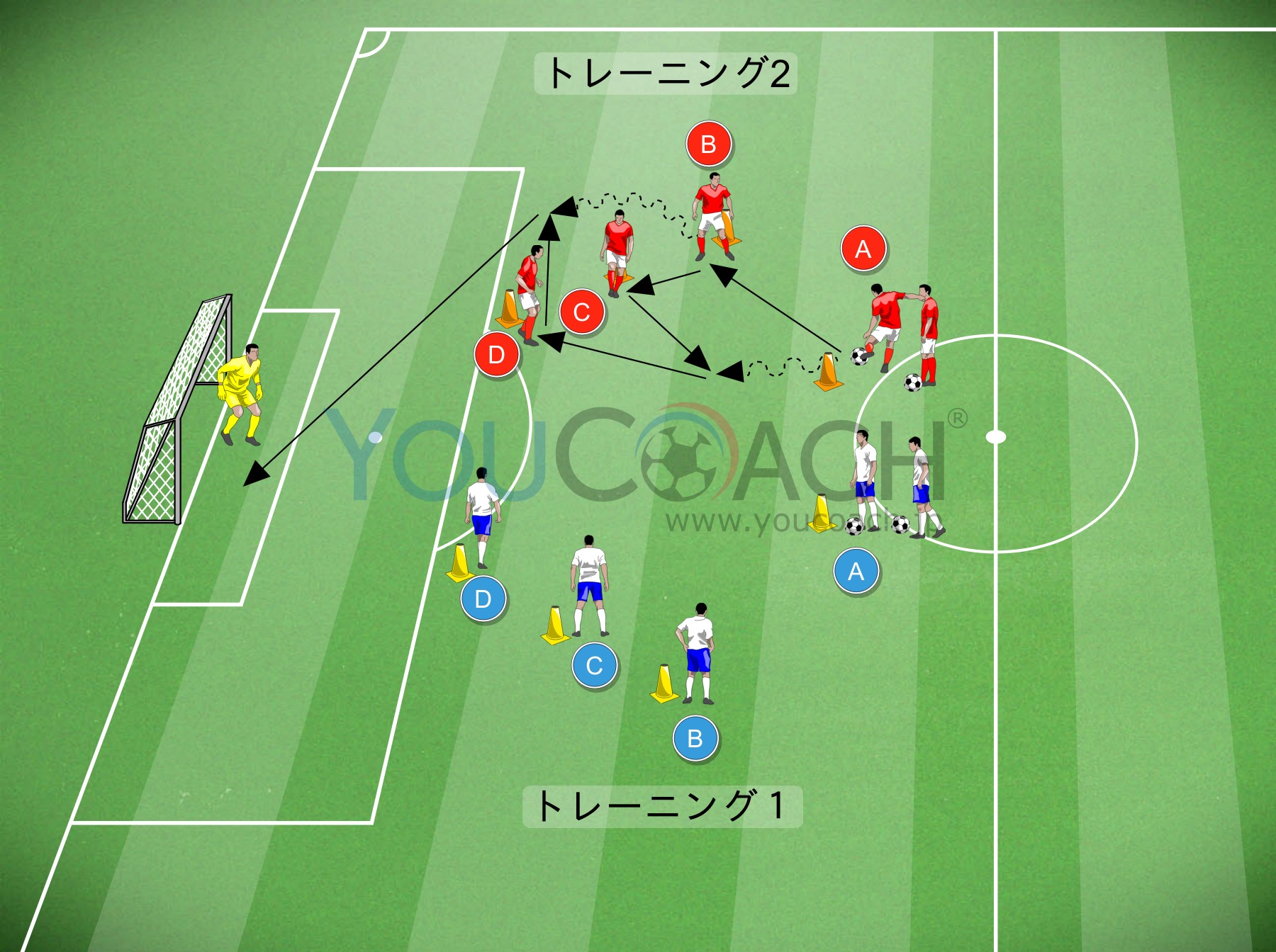 - BはDと素早くコンビネーション(ワンツー)を行います。