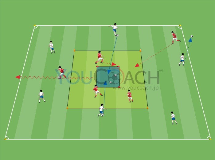 20m×20mのコートをマーカー4つで作る。続いて、その中に4つのコーンで作った大きいボックスと4つのマーカーで作った小さなボックスを作る。それぞれのボックスの1辺は8mと4mで作る。プレイヤー11人を6人のフェンス、5人ののディフェンス(赤のビブス)にわかれ、中央のボックスにボールを6つ配置し、プレイヤーはボールを持たずプレーエリアの外からプレーをスタートする。