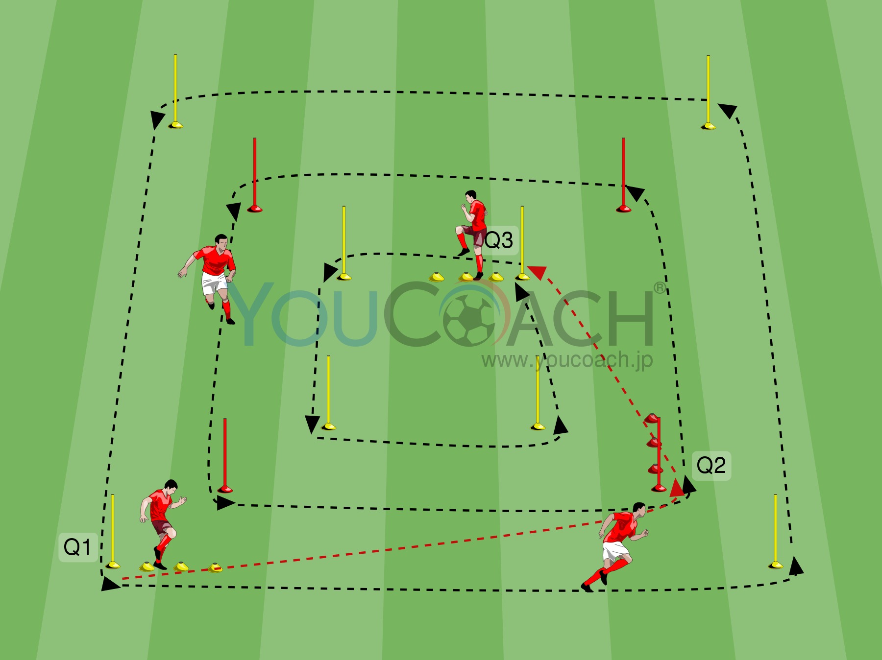 - Q1からスタートするプレイヤーはマーカー上で膝上げ、右回りでダッシュ。