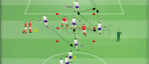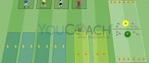 - コーンのプレイヤーは同時にゆっくりドボールを受けるために移動しているマーカーの所にいる2人目のプレイヤー、このプレイヤーもパッシブなプレッシャーを受けているのだが、へパスを出す