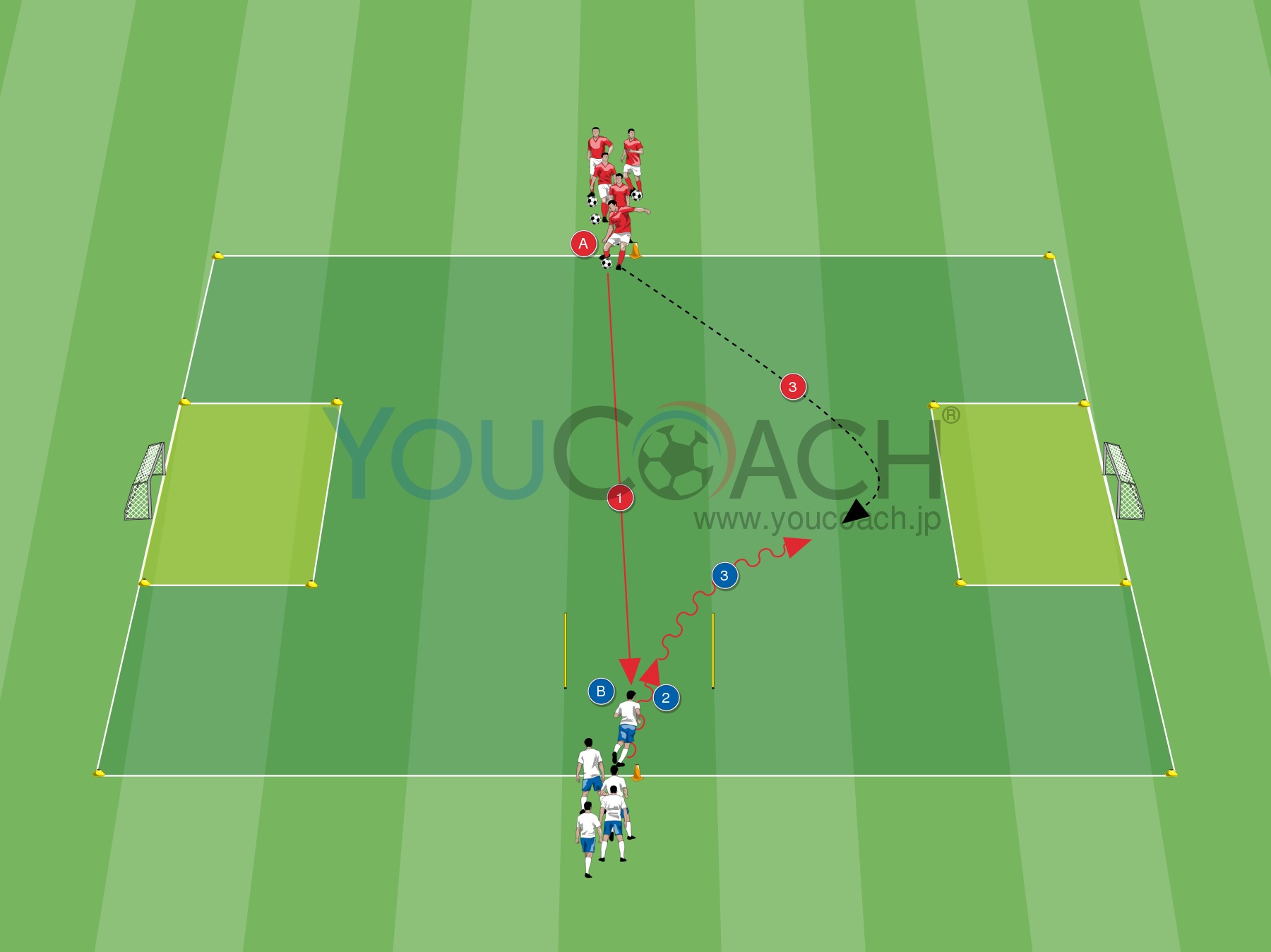 - もしディフェンス役のプレーヤーAがボールを奪ったら、反対サイドのミニゴールに攻撃。