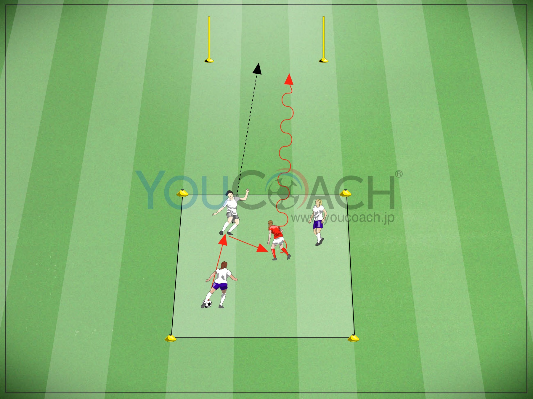 7x7mのスクエアをマーカーで準備します。スクエアから5m先にはポール2本でゲートをセット。 スクエア内に白3名 対 赤1名の状況で白ボールから始めます。