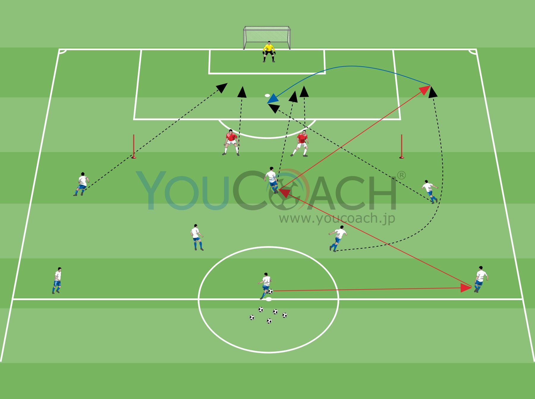 この第一段階ではクロスを除いて、パスは図のように味方にグラウンダーのパス交換をしなければいけない。トレーニングの最初はディフェンスはキーパーを除いてパッシブに行うが彼らの存在の重要性を感じながら行う。
