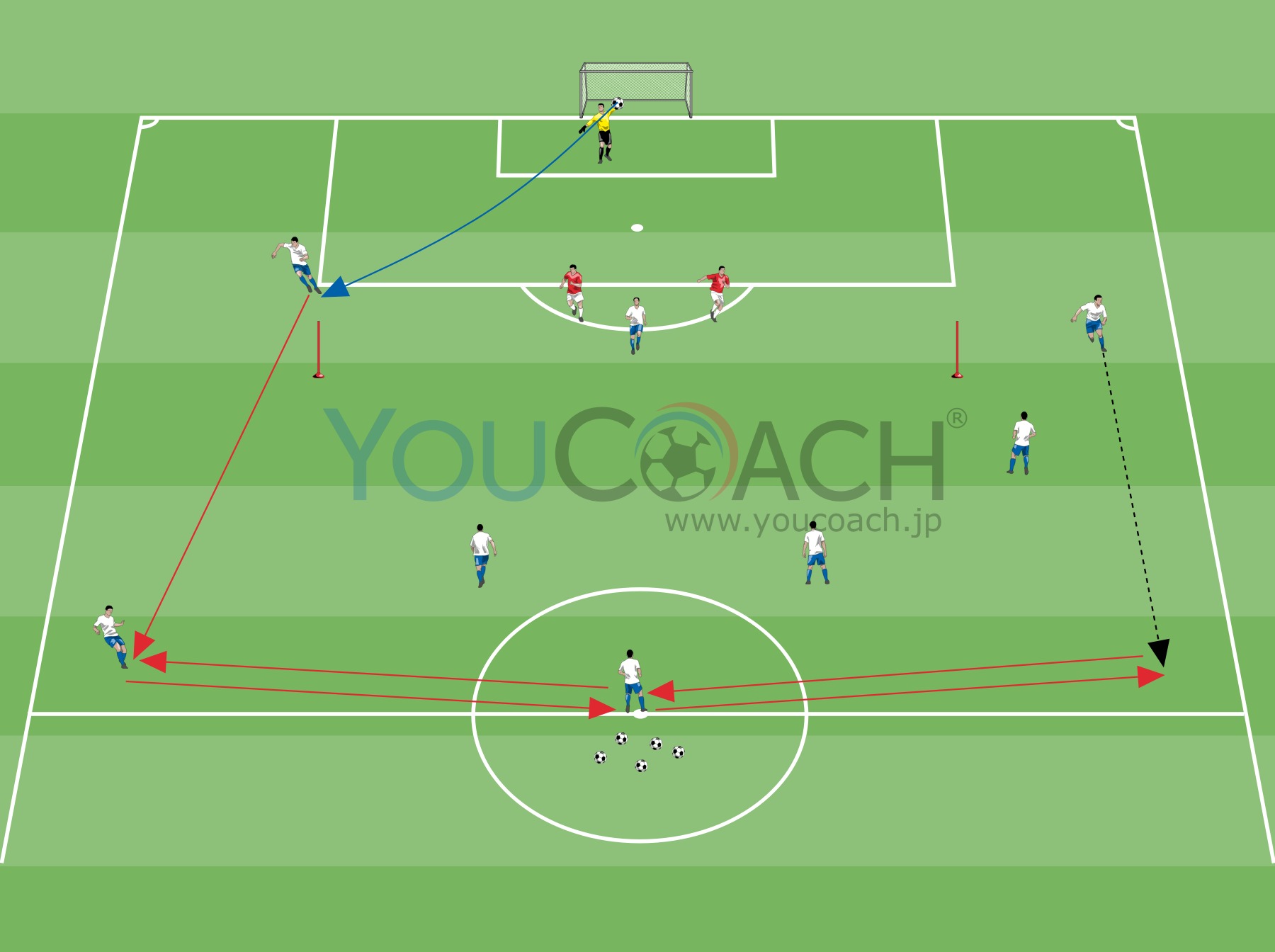 CCがボールをもってバリエーション1を行うところから開始する。ディフェンスはパッシブ。プレーが終わったらキーパーはすぐに、ブラインドとなっているサイドつまりクロスを上げたサイドとは反対のウィングのプレーヤーにボール(ボールをセービング、もしくは外に出てしまった後に手元にボールがない場合はゴールの中から新しいボールをとって)を出して、プレーを再開する