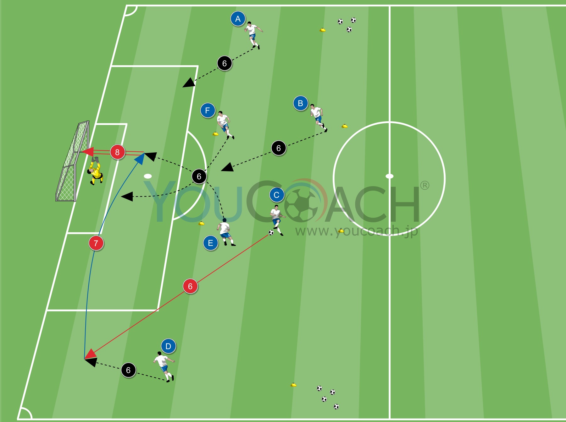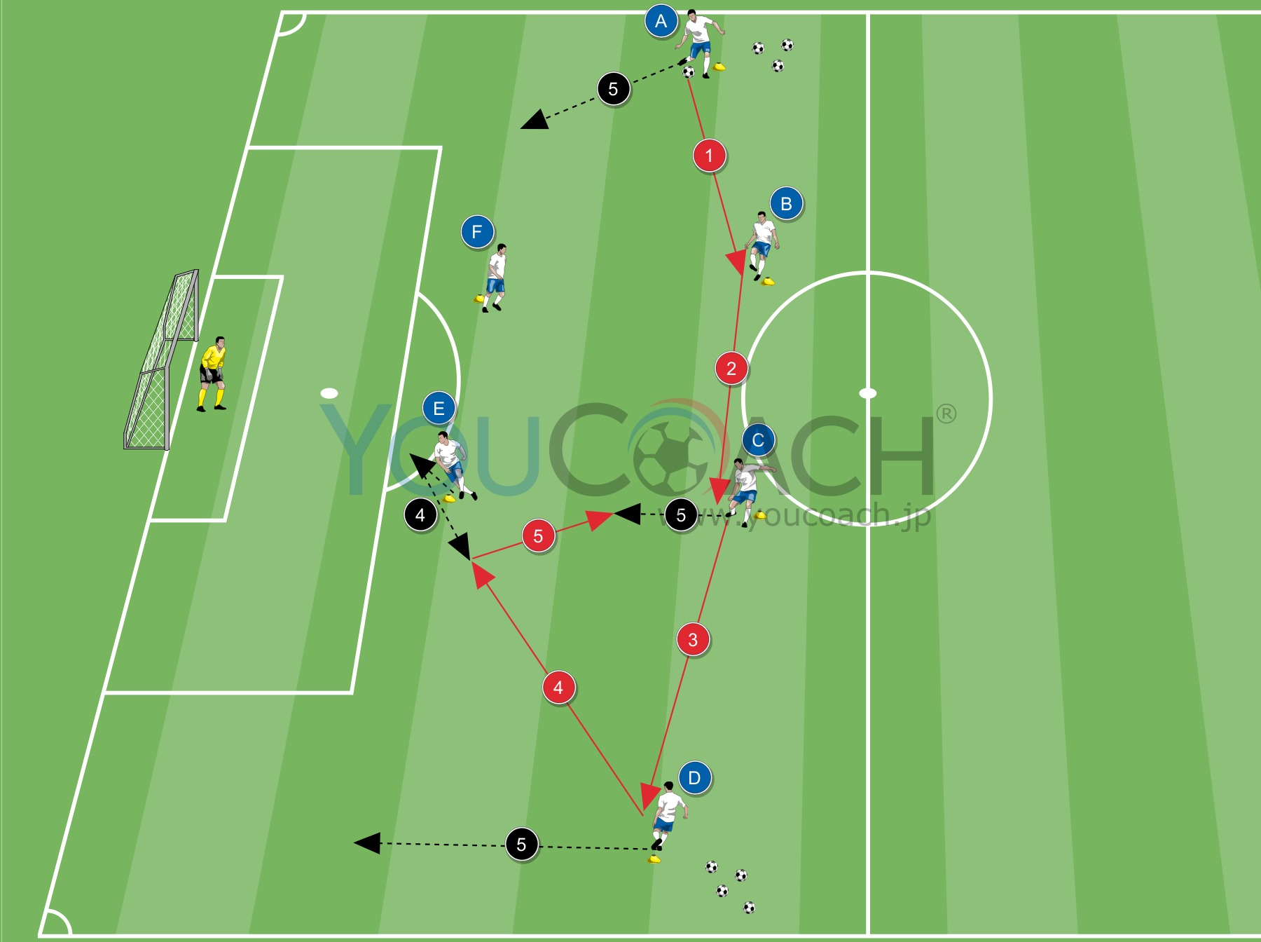 - Dがクロスボールを上げ、図例では最後Eがフィニッシュ。