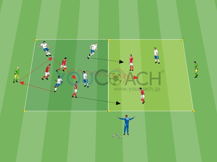 - プレーエリア内では4対3のポゼッション。フリーマンを加えると5対3になります。