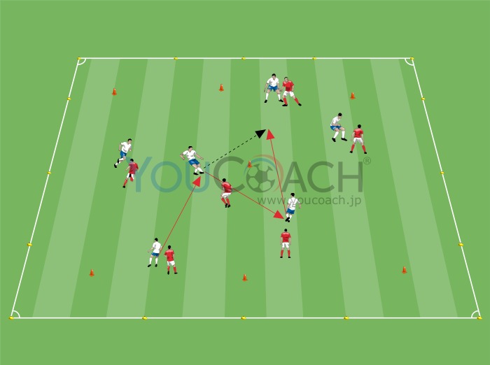 - 両チーム100%のインテンシティで臨むためのアドバイスとして、オプションの追加をおすすめします。例えば、「6回連続パス成功で1点」といったオプションを加える事でチーム間のパスワークのテンポを一段階引き上げることができます。ディフェンス側も連続パスを阻止するためにもプレッシャーのインテンシティが上がってきます。