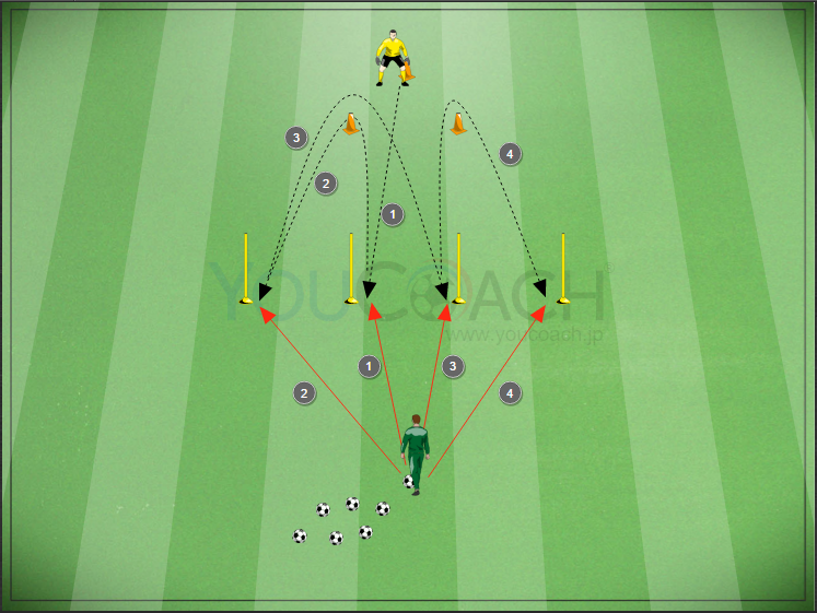 プレーエリア内に図のようにコーンを3個配置します。そしてコーンから3m先に2m間隔でポールを計4本セットします。 GKは中央のコーンからプレーをスタートします。GKから12m先にはボール配給役のコーチをスタンバイ。