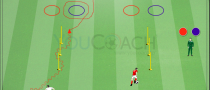 ピッチ中央に5m四方のスクエアを配置。 スクエアの目の前にはオフェンス用(ゾーンA)のスラロームをコーン3つで準備。 反対側にはゴールを設置。 ピッチ左にはディフェンス用(ゾーンB)のスラロームをコーン2個とフラフープで作ります。...
