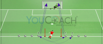このトレーニングは待ち時間を要するため、いざプレーが始まると最大限のインテンシティをもって行われます。そのため少人数制のグループを作っておくことをオススメします。 ペナルティエリアのライン上、中央付近にポールを5m間隔で2本セットします...