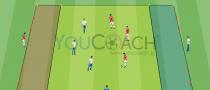 マーカーで40×30メートルのプレーエリアを作ります。更に、マーカーでコートを3つのゾーン(2つのサイドのゾーンは5×30メートル、中央のエリアは30×30メートル)に図のように分けます。...