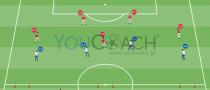 このトレーニングの参加人数の単位は12、15、18名です。5名のプレーヤーはピッチ内、2名のプレーヤーは両サイドでフリーマン役、GKを2名。1プレーあたりの所要時間は30秒で、合間に60~90秒のインターバルを挟みましょう。...