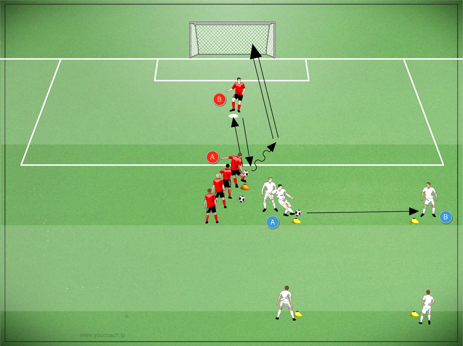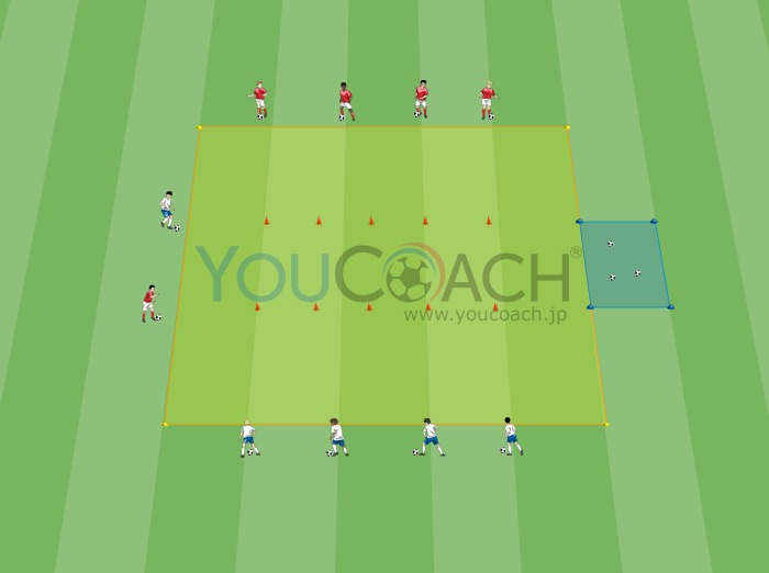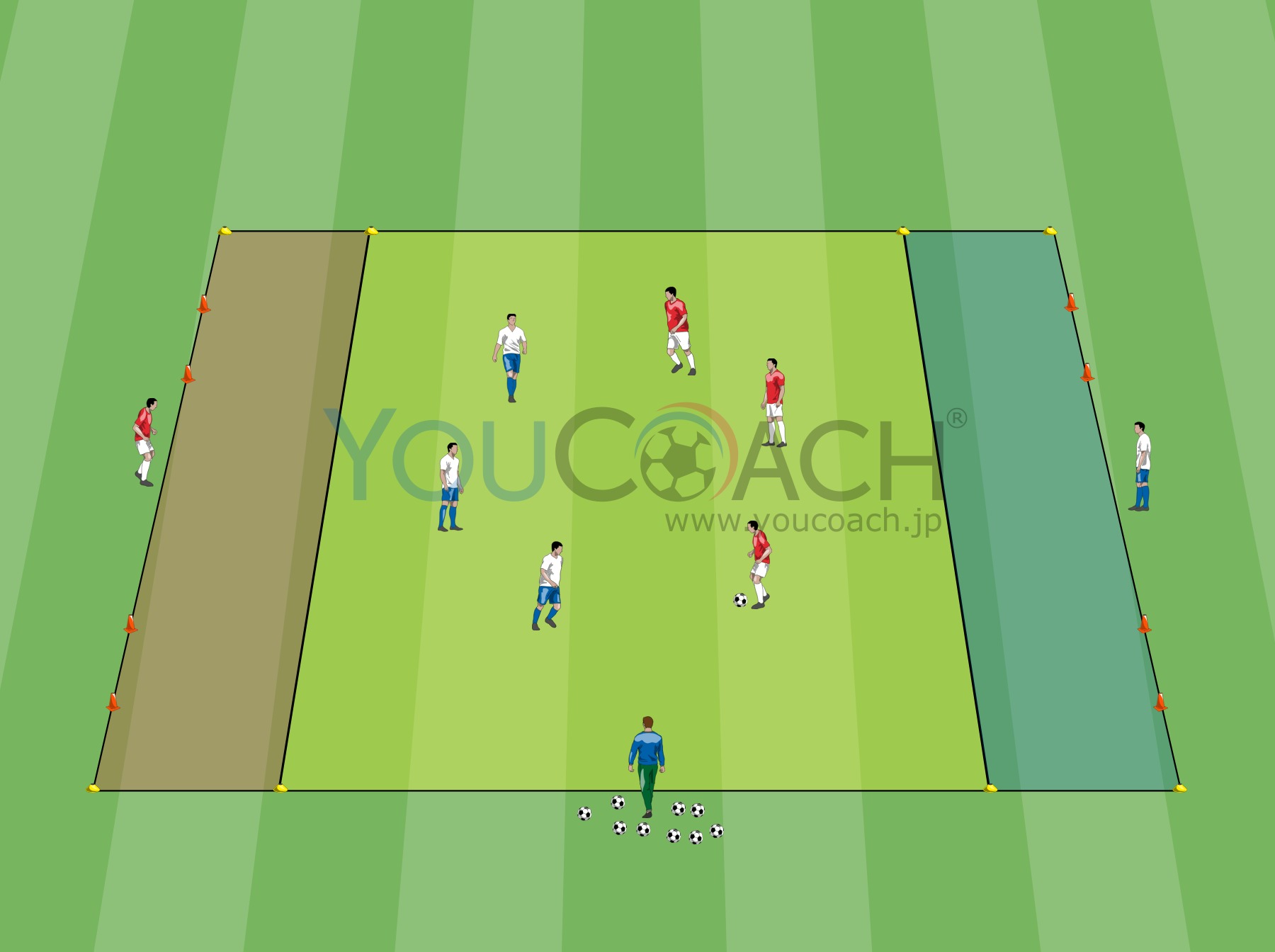 ボールポゼッション - オフェンス局面、ディフェンス局面、ボールポゼッションそしてパスを磨くために効果的な制限されたスペース内での3対3トレーニング -