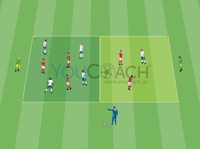 2ライン上での3対2 - 縦への展開とトランジションの能力を伸ばすと共に、有酸素性ポテンシャル(潜在能力)を高めます。 -