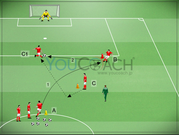 遠い距離からの枠内シュート - 指定エリアでコントローロ・オリエンタートからロングシュートのトレーニング -