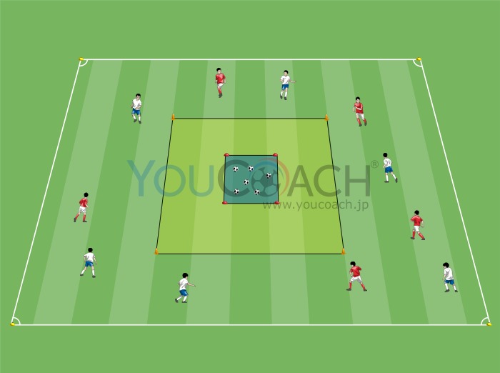6対6の試合にフリーマン4名、そして1対1ゾーンを加えた条件付きトレーニング