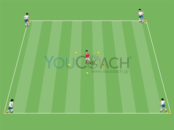 1対1 - 集中力やプレースピードをトレーニングに最適なサイコキネティクストレーニングです。頭の回転の速くし個人能力を鍛えるトレーニング。プレイヤーはコーチの指示の後、1対1をする。 -