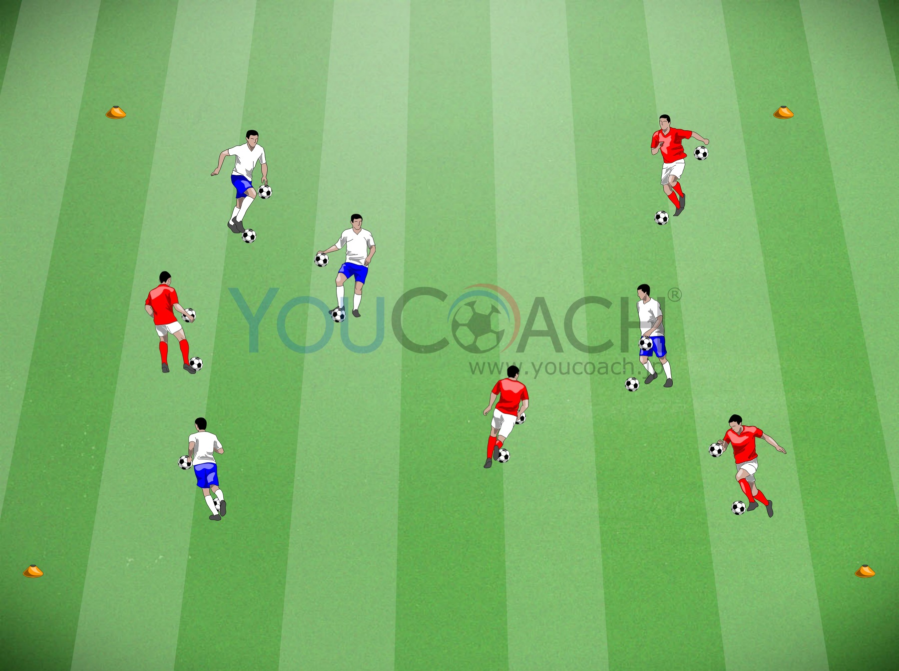 ボール扱い - 障害物間を抜けるドリブルとトレーナーの指示に狙いを定めたパス