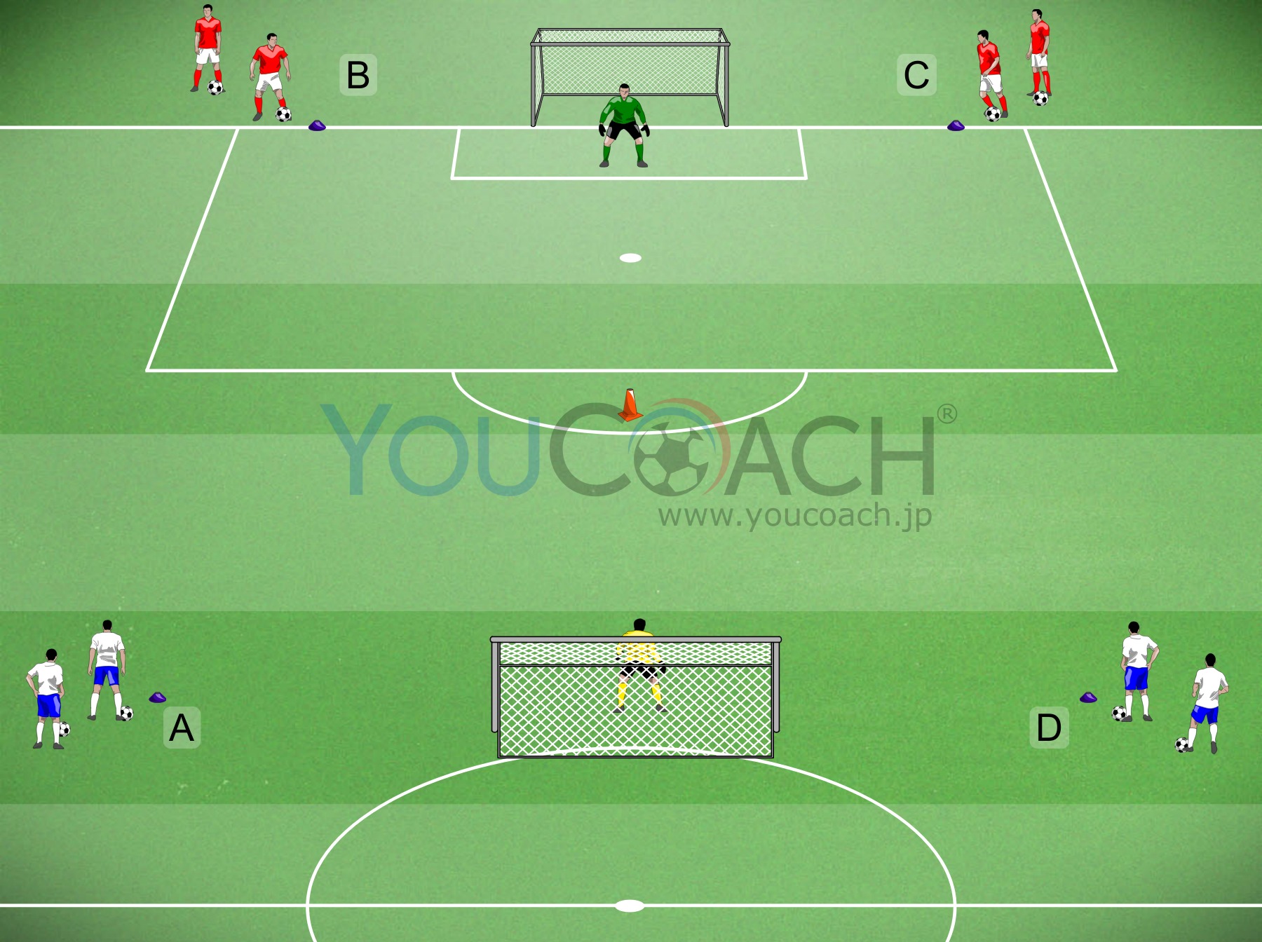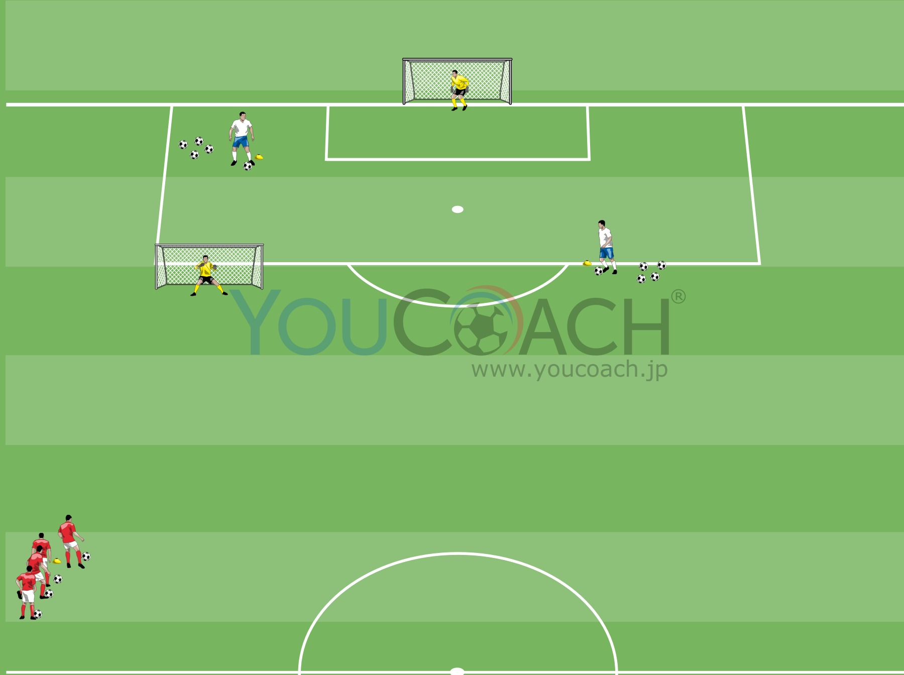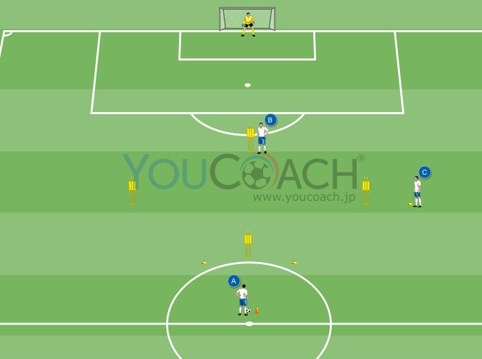 フィニッシュ - 相手のマークを外す動きをしながらグランダーパスのパス交換をしフィニッシュまで持っていくトレーニング -